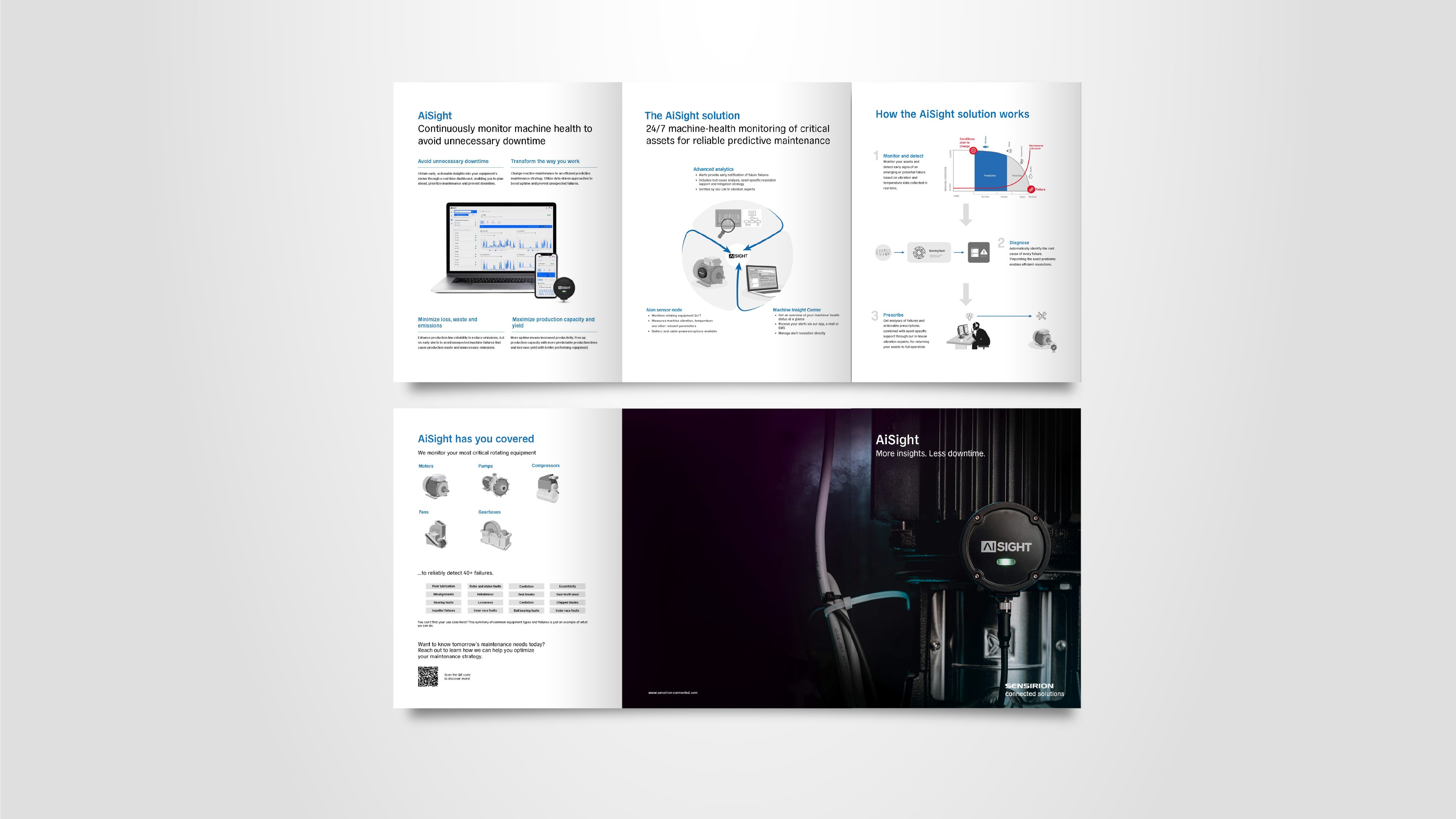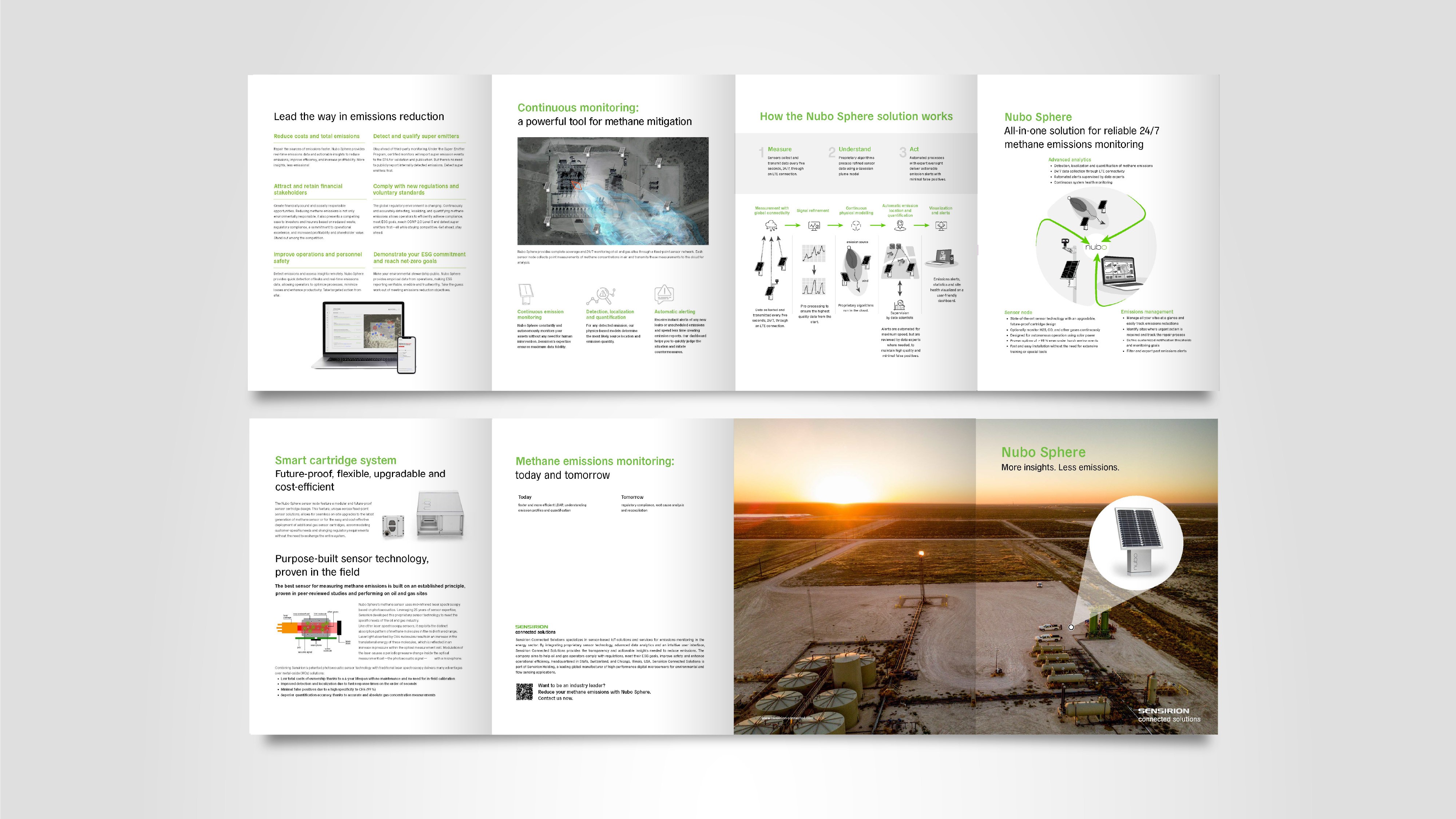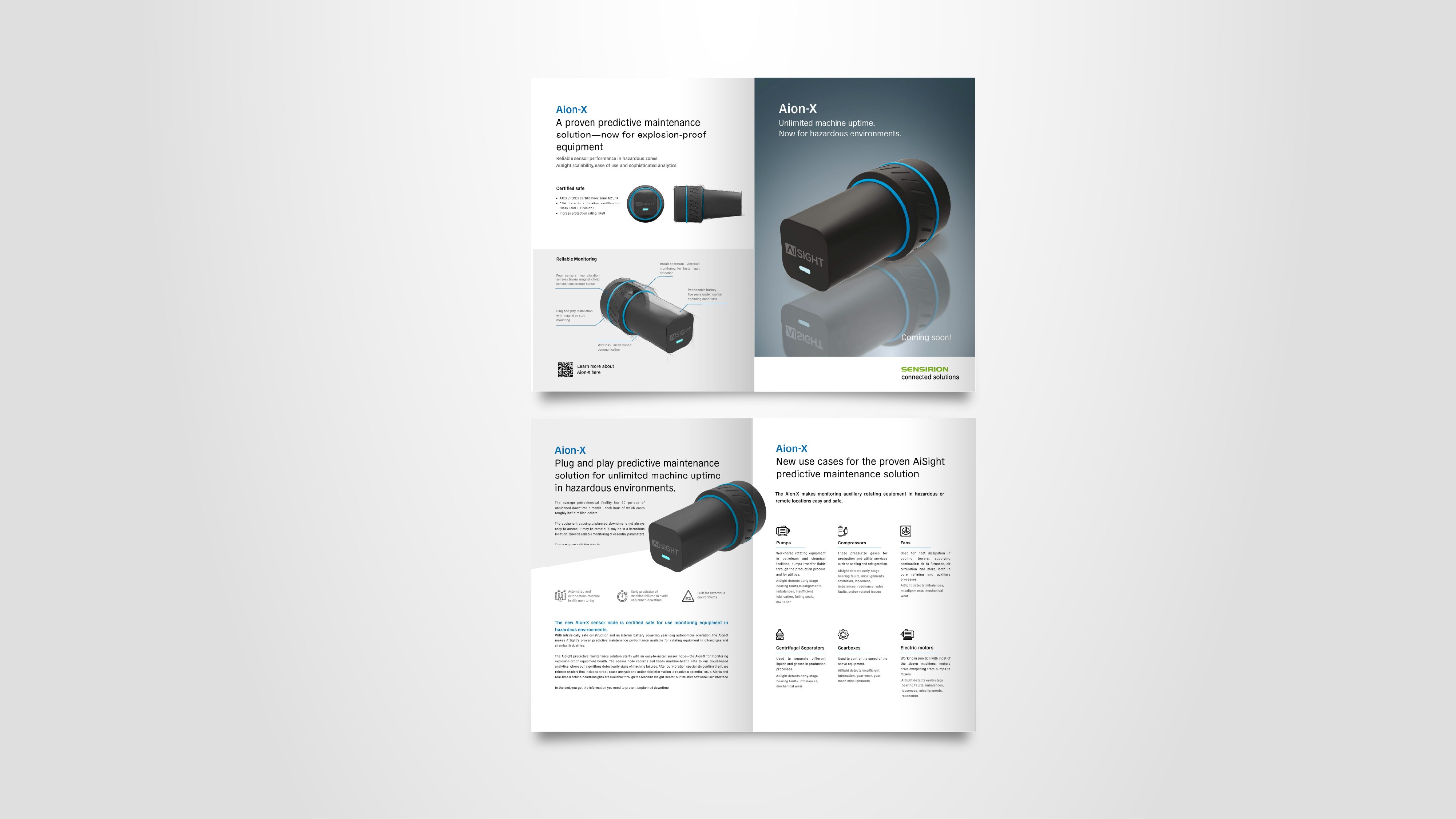 Brochures in A4 for Sensirion Connected Solutions products, AiSight and Nubo Sphere. Print medias with folds used for events and digital format shared with potential clients and partners. Responsabilities: - all the design, adapted from their parent company style, Sensirion UG. - Hiring, briefing and overseeing an illustrator. - creating mockups, graphics and selecting images. - Presentation and approval with stakeholders.